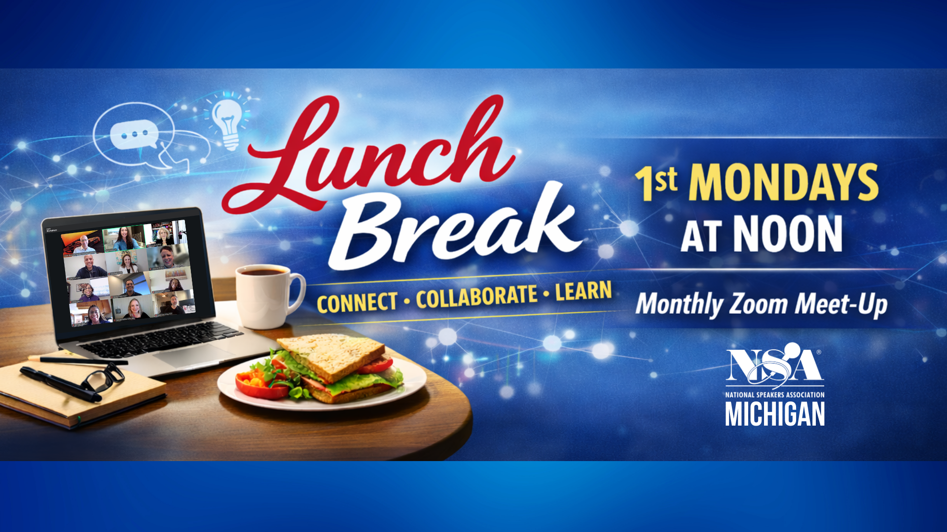 NSA Michigan Lunch Break is a monthly, casual Zoom meetup designed to help NSA Michigan members connect, collaborate, and support one another in their speaking businesses. Held on the first Monday of each month from 12:00–1:00 p.m., these informal calls are a chance to bring your lunch, pop in as you’re able, and join conversations on pre-determined speaking-related topics each month. Expect a great time of sharing ideas and asking questions!